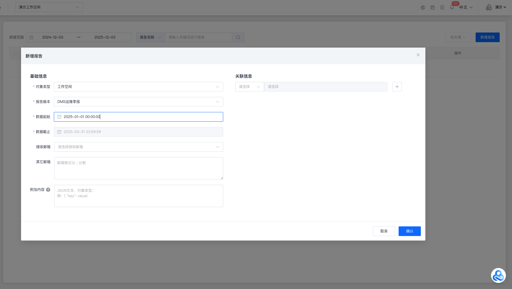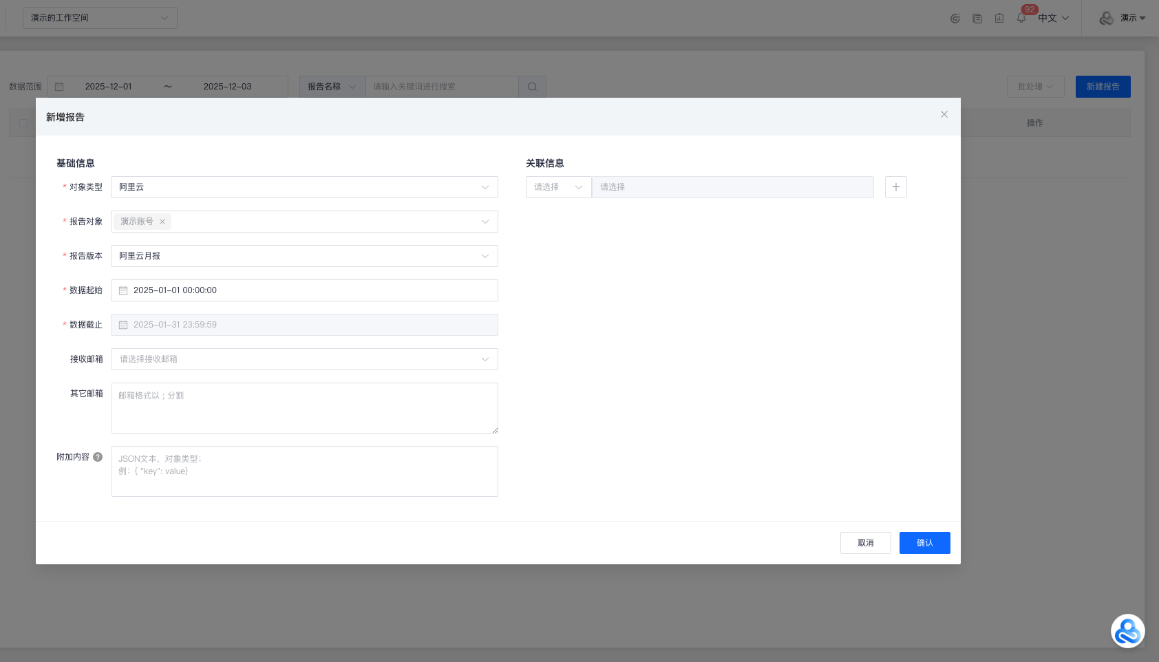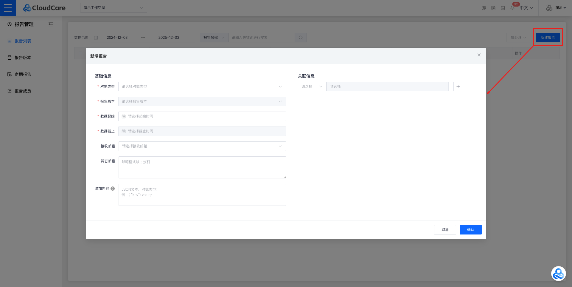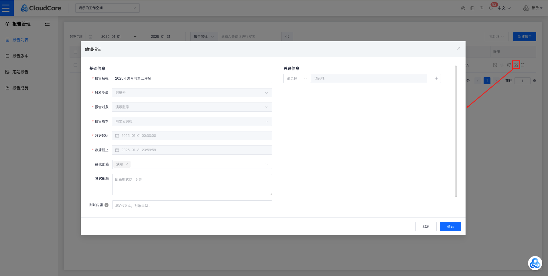 点击左上角 “功能菜单”,找到 “报告管理”-“报告列表” 后,点击进入“[报告列表](https://enterprise.cloudcare.cn/report/list)”功能页面。  # 报告列表 > 用于管理以及展示报告的信息,可以对列表中的报告进行:新建/预览/查看详情/更新/编辑/删除等操作。  ### 新建 点击右上角 “新建报告”,并在 “新增报告” 弹窗中填写以下字段信息: - 基础信息 - 对象类型(工作空间 / 云账号) - 报告对象(根据选择的“对象类型”判断是否展示) - 报告版本(针对“报告对象”展示对应的报告版本) - 起始时间(报告的开始时间) - 结束时间(报告的结束时间) - 接收邮箱(选择账号) - 其他邮箱(邮箱格式以;分割) -附件内容(只支持json格式;可点击旁边的问号查看参考模版) - 关联信息 - 用于其他模块(情报/报告/资产/审批/事件)的关联  > 工作空间类型展示页面:  > 云账号(阿里云 / 火山引擎 / AWS / 华为云)类型展示页面:  点击“确认”后,即可完成报告创建。 > 报告完成更新后,支持预览/详情/更新/发送/编辑/删除的操作。  ### 预览 点击操作栏中的“预览”按钮,会打开新的标签页就行预览。 > 预览时可以以PDF格式保存报告。  ### 详情 点击操作栏中“详情”按钮,即可查看报告的详情:   > 关联信息中为超链接,点击后可直接跳转对应内容的详情。  ### 更新 > 同步后,原有报告数据将会被覆盖,请谨慎操作。  ### 发送 > 发送报告后会隐藏发送按钮;需要修改接收邮箱或者其他邮箱选项,发送按钮才会再次展示。  ### 编辑 点击操作栏中“编辑”按钮,即可编辑报告的字段: - 基础信息 - 报告名称(默认生成的,可编辑) - 接收邮箱(选择账号) - 其他邮箱(邮箱格式以;分割) - 附加内容(只支持json格式;可点击旁边的问号查看参考模版) - 关联信息 - 用于其他模块(情报/报告/资产/审批/事件)的关联 点击“确认”后可保存修改的信息。  ### 删除 点击操作栏中的 “删除” 按钮,并进行二次确认,即可删除。 > 删除后,原有关联信息将会丢失,请谨慎操作。  ### 筛选 报告列表页面支持以下条件筛选方式: - 数据范围(支持报告的数据起始/截止时间搜索) - 报告名称(支持报告的名称模糊检索) - 报告ID(支持报告的ID搜索) - 报告对象(支持报告对象的名称模糊检索)  ### 批处理 可以对报告进行批量处理,支持合并/更新/发送/删除操作。 #### 合并 点击批处理下拉框中的“合并”按钮,会弹出合并报告的确认弹窗。 > 勾选的报告必须“报告版本”、“数据起始/截止”时间均相同才可执行合并操作。 > 目前支持合并的报告版本:阿里云月报/阿里云账号权限清单/阿里云安全组Excel/阿里云资产Excel。   #### 更新 点击批处理下拉框中的“更新“按钮,会弹出更新报告的确认弹窗,点击确认后会更新勾选的报告。   #### 发送 点击批处理下拉框中的“发送“按钮,会弹出发送报告的确认弹窗,点击确认后会发送勾选的报告到对应的邮箱。   #### 删除 点击批处理下拉框中的“删除“按钮,会弹出删除报告的确认弹窗,点击确认后会删除勾选的报告。