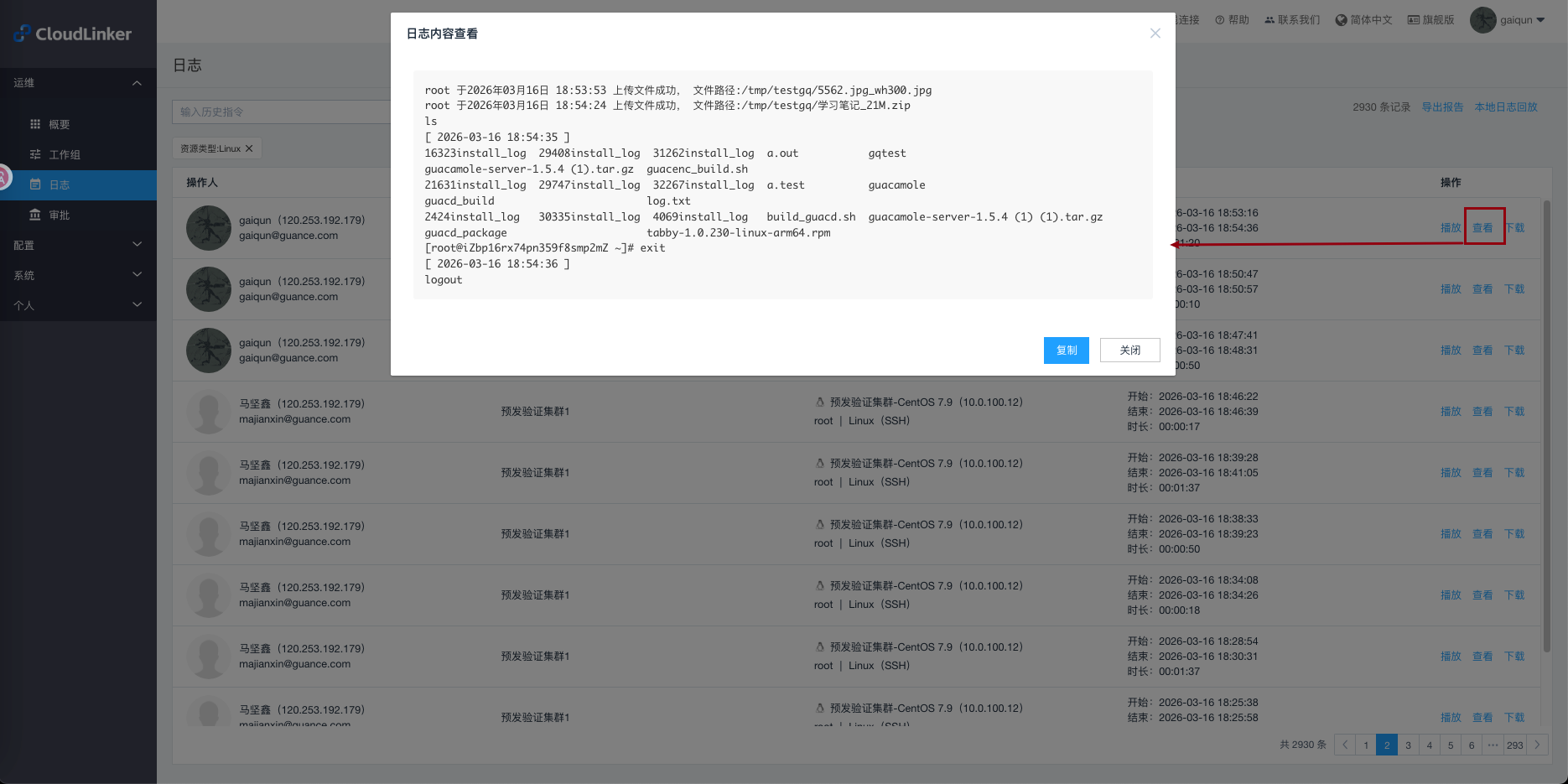 日志是您和您的团队成员操作所有资源的日志集合,记录成员的详细操作,可重放、下载及生成报告。 (注:日志超过366天后会自动归档,即该日志处于“冻结”状态;如需要查看或者下载,需先对日志文件进行“解冻”操作)  日志列表按时间排序,默认搜索为历史操作指令。  日志支持高级搜索,按资源类型、操作指令、成员、来源IP、资源名称、时间范围等进行搜索。   Windows日志支持“播放”、“下载”的操作;Linux日志支持“播放”、“查看”、下载的操作;数据库日志支持“查看”、“下载”的操作。 Windows日志 / Linux日志点击“播放”按钮后,逐步显示该用户在服务器上的操作;还可以支持重新开始、启动/暂停、加速、减速操作。  Linux日志/数据库日志 点击“查看”按钮后,会弹出弹窗,可在弹窗内查阅日志详情。  日志下载后,可在本地进行查看;Windows日志下载后,可在"[本地日志回放](https://csos.cloudcare.cn/api/video/rdp_replay)"页面上传日志文件,进行视频回放。
