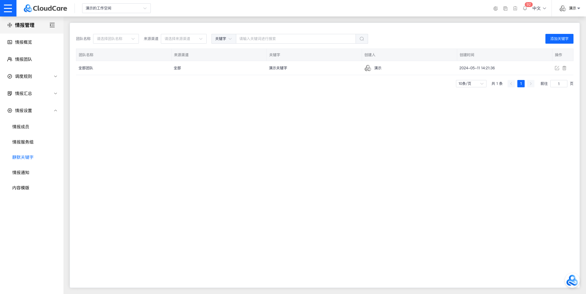 点击左上角 “功能菜单”,找到 “情报管理”-“[情报设置](https://enterprise.cloudcare.cn/issue/setting/member "情报设置")” 后,点击进入 “[情报设置](https://enterprise.cloudcare.cn/issue/setting/member "情报设置")” 功能页面。  情报设置中包含:“情报成员”,“情报服务组”,“静默关键字”,“情报通知” 四个功能页面。 # 情报成员 > 情报成员列表用于管理以及展示情报成员信息。  ## 添加成员 点击右上角 “添加成员”,并在 “添加成员” 弹窗中填写以下字段信息: - 账号(当前空间下未被添加到情报模块的空间成员) - 真实姓名(选择账号后自动填充) - 邮箱(选择账号后自动填充) - 手机号(选择账号后自动填充) - 情报角色(管理员(情报)/ 读写(情报)/ 只读(情报)) - 备注(内容长度不得超过 200 字符)  点击 “确认” 后,即可完成情报成员添加。 > 情报成员创建完成后,支持编辑 / 删除两种操作。 ## 编辑成员 点击操作栏 “编辑” 按钮,即可编辑情报成员的以下字段信息: - 情报角色(管理员(情报)/ 读写(情报)/ 只读(情报)) - 备注(内容长度不得超过 200 字符)  点击 “确认” 后可保存修改的信息。 ## 删除成员 点击操作栏中的 “删除” 按钮,并进行二次确认,即可删除指定的情报成员。 > 删除后,将保留该成员相关情报数据,但情报内容不再对其可见。 默认空间下的主账号以及子账号无法被删除。  ## 筛选成员 情报成员列表页面支持以下条件筛选方式: - 角色(管理员(情报)/ 读写(情报)/ 只读(情报)) - 账号(支持账号或者昵称模糊检索)  # 情报服务组 > 可将情报成员加入不同的服务组,并用于情报策略调度配置。 ## 新建服务组 点击右上角 “新建服务组”,并在 “新建服务组” 弹窗中填写以下字段信息: - 服务组名称 - 调度周期(支持:每天/每周/法定工作日/法定节假日/自定义时间范围) - 服务时间(选择0-24时间的任一范围作为可调度时间,时间范围外将不做通知) - 调度方式(支持全组调度与均衡调度) - 全组:通知全组成员 - 均衡:根据组内成员当前受理中的情报数量,以及历史处理情况,分配当前相对“空闲”的成员进行通知 - 成员(至少有一名成员,支持多选) 点击 “确认” 后,即可完成情报服务组创建。  ## 编辑服务组 点击操作栏 “编辑” 按钮,即可编辑情报服务组的以下字段信息: - 服务组名称 - 调度周期(支持:每天/每周/法定工作日/法定节假日/自定义时间范围) - 服务时间(选择0-24时间的任一范围作为可调度时间,时间范围外将不做通知) - 调度方式(支持全组调度与均衡调度) - 全组:通知全组成员 - 均衡:根据组内成员当前受理中的情报数量,以及历史处理情况,分配当前相对“空闲”的成员进行通知 - 成员(至少有一名成员,支持多选) 点击 “确认” 后,即可保存修改信息。  ## 删除服务组 点击操作栏中的 “删除” 按钮,并进行二次确认,即可删除指定的情报服务组。  # 静默关键字 > 完成配置静默关键字规则配置后,符合关键字匹配规则的情报将被导入“已静默情报”列表中,并且不会再根据其匹配的策略规则进行调度或升级。  ## 添加关键字 点击右上角 “添加关键字”,并在 “添加关键字” 弹窗中填写以下字段信息: - 团队名称 - 来源渠道 - 关键词 点击 “确认” 后,即可完成“静默关键字”的添加。  ## 编辑关键字 点击操作栏 “编辑” 按钮,即可编辑“静默关键字”的以下字段信息: - 团队名称 - 来源渠道 - 关键词 点击 “确认” 后可保存修改的信息。  ## 删除关键字 点击操作栏中的 “删除” 按钮,并进行二次确认,即可删除指定的“静默关键字”。  # 情报通知 > 该模块中所配置的webhook地址以及加密签名的主要被用于情报策略调度或其他模块的调度通知时使用。  ## 添加通知对象 点击右上角 “添加通知对象”,并在 “添加通知对象” 弹窗中填写以下字段信息: - 名称 - 类型(邮箱/ 钉钉群机器人/ 企微群机器人/ 飞书群机器人) - 地址(填写webhook地址,支持https) - 校验码(非必填,如有设置则填写webhook地址加密签名) - 飞书应用(当类型选择“飞书群机器人”时,才会显示该选项;如何配置“飞书应用”可参考文档“[配置管理](https://mrdoc.cloudcare.cn/doc/393/)”-“[第三方应用](https://mrdoc.cloudcare.cn/doc/393/#h1-u7B2Cu4E09u65B9u5E94u7528)”进行配置)  ## 编辑通知对象 点击操作栏中的 “编辑” 按钮,即可编辑“情报通知地址”的以下字段信息: - 名称 - 类型(无法编辑) - 地址(填写webhook地址,支持https) - 校验码(非必填,如有设置则填写webhook地址加密签名) - 飞书应用(当类型为“飞书群机器人”时,才会显示该选项)  ## 禁用/启用通知对象 点击操作栏中的 “禁用” 按钮,并进行二次确认,即可禁用指定的情报通知地址。 > 禁用后,调度中配置的该通知地址将不再可达。  点击操作栏中的 “启用” 按钮,并进行二次确认,即可启用指定的情报通知地址。  ## 删除通知对象 点击操作栏中的 “删除” 按钮,并进行二次确认,即可删除指定的情报通知地址。  # 内容模版 > 该模块中所配置的模版主要被用于创建/编辑事件 选择模版时进行内容自动填充。 选择模版时,需先选择事件的“类型”。点击 “快速模板” 则根据当前事件类型 快速匹配模板中 首个 / 置顶 同类型模板;点击“其他模版”则根据当前事件类型 展示所有的模版列表。  ## 创建模版 点击右上角 “创建模版”,并在 “创