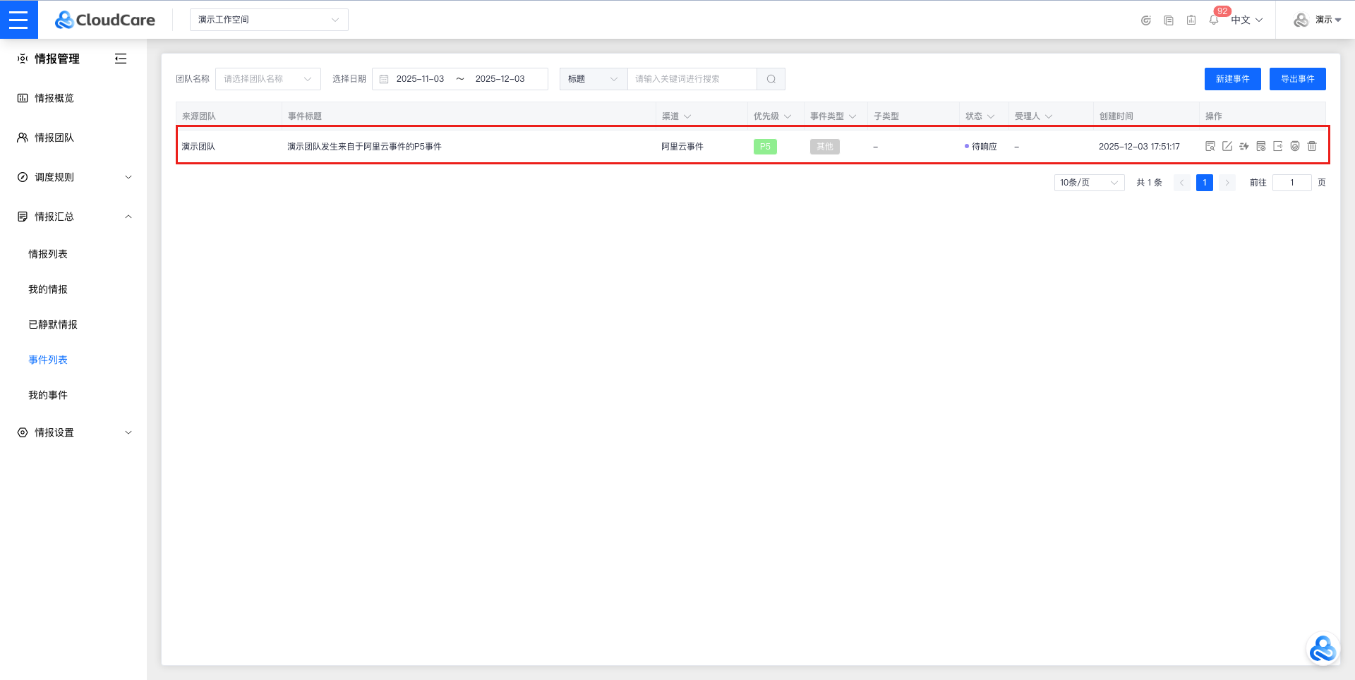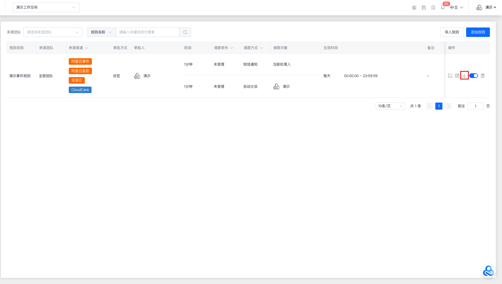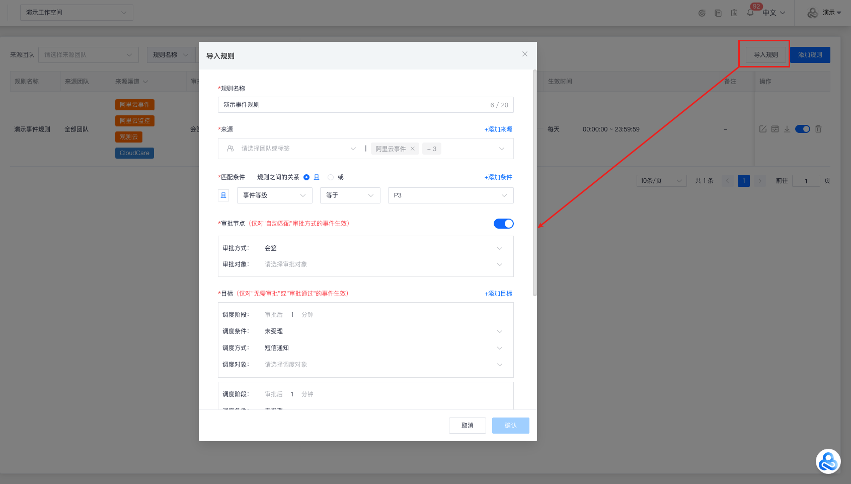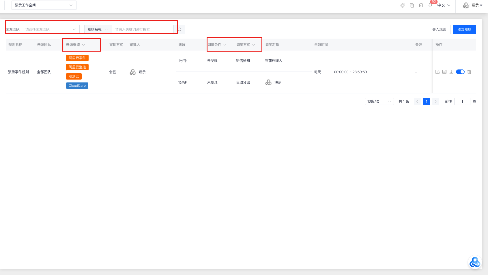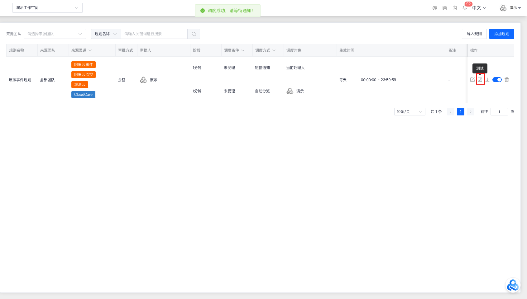 点击左上角 “功能菜单”,找到 “情报管理”-“[调度规则](https://enterprise.cloudcare.cn/issue/dispatch/alarm "调度规则")” 后,点击进入 “[调度规则](https://enterprise.cloudcare.cn/issue/dispatch/alarm "调度规则")” 功能页面。  “调度规则”中包含:“情报调度”,“事件调度”,“静默规则” 三个功能页面。 > 注意:调度规则优先级顺序为:“静默规则”>“情报调度”=“事件调度”,即当情报符合“静默规则”时,将优先进行屏蔽,而不再进入“情报调度”以及“事件调度”的条件匹配。  # 情报调度 > 在“情报调度”列表中,可以对列表中的情报调度规则进行:添加/编辑/测试/禁用/删除/导入/导出等操作。 ## 添加情报调度规则 点击右上角 “添加规则”,并在 “添加规则” 弹窗中填写以下字段信息: - 规则名称(20字符以内) - 来源信息(包含团队和渠道信息;团队可选择“全部团队”,选择该选项后,该空间下所有团队都会执行该规则) - 匹配条件 - 规则之间的关系(且 / 或) - 匹配字段(情报等级/ 情报标题/ 情报内容/ 实例名称/ 实例ID) - 匹配方式(等值比较/包含匹配/ 枚举匹配/ 大小比较等) - 匹配内容(即字段用于匹配的关键字或关键字列表) - 调度目标 - 调度阶段(根据调度对象的创建时间距今的分钟数作为阶段) - 调度条件(未受理/ 未恢复) - 调度方式(升级事件(无需审批)/ 自动分派/ 钉钉群通知/ 企微群通知/ 飞书群通知/ 短信通知/ 邮件通知/ 电话通知 /连续电话通知/ 自动恢复) - 调度对象(事件等级/ webhook/ 当前指派人/ 情报成员/ 情报服务组) - 生效时间 - 生效周期(每天/ 法定工作日/ 法定节假日 / 自定义) - 时间范围(起始时间-截止时间) - 说明(规则备注说明) 点击 “确认” 后,即可完成情报调度规则的创建。  ## 操作栏 ### 编辑 点击操作栏中的“编辑”按钮,即可编辑该情报调度的规则信息。  ### 测试 点击操作栏中的“测试”按钮,将会根据该情报调度规则配置的团队以及渠道生成情报,同时该情报将会触发当前规则调度通知,用于测试调度方式联通性。   ### 导出 点击操作栏中的“导出”按钮,默认以.json格式文件保存该情报调度规则。  ### 禁用/启用 点击操作栏中的“禁用/启用”按钮,在“禁用/启用”弹窗中二次确认,即可完成情报调度规则的禁用或启用。   ### 删除 点击操作栏中的“删除”按钮,在删除弹窗中二次确认,即可删除该情报调度规则。  ## 导入规则 点击右上角 “导入规则”,选择符合情报调度规则的json格式的文件进行导入,导入后可在 “导入规则” 弹窗中填写或修改字段信息。(注:情报团队和调度对象必须手动填写。)  ## 筛选 支持来源团队 / 规则名称 / 调度对象 / 来源渠道 / 调度条件 / 调度方式 /生效周期等字段的筛选功能。  # 事件调度 > 在“事件调度”列表中,可以对列表中的事件调度规则进行:添加/编辑/测试/禁用/删除/导入/导出等操作。 ## 添加事件调度规则 点击右上角 “添加规则”,并在 “添加规则” 弹窗中填写以下字段信息: - 规则名称(20字符以内) - 来源信息(包含团队和渠道信息;团队可选择“全部团队”,选择该选项后,该空间下所有团队都会执行该规则) - 匹配条件 - 规则之间的关系(且/ 或) - 匹配字段(事件等级/ 事件标题/ 事件内容/ 是否加急 / 事件类型 / 产品类型) - 匹配方式(等值比较/ 包含匹配/ 枚举匹配/ 大小比较等) - 匹配内容(即字段用于匹配的关键字或关键字列表) - 审批节点(仅对"自动匹配"审批方式的事件生效) - 审批方式(会签 / 任签) - 审批人(多选的情报成员列表;至多可选择三人) - 调度目标(仅对"无需审批"或"审批通过"的事件生效) - 调度阶段(根据调度对象的创建时间距今的分钟数作为阶段) - 调度条件(未受理/ 未完成) - 调度方式(自动分派/ 钉钉群通知/ 企微群通知/ 飞书群通知/ 短信通知/ 邮件通知/ 电话通知/ 连续电话通知) - 调度对象(webhook/ 当前指派人/ 情报成员/ 情报服务组) - 生效时间 - 生效周期(每天/ 法定工作日/ 法定节假日 /自定义) - 时间范围(起始时间-截止时间) - 说明(规则备注说明) 点击 “确认” 后,即可完成事件调度规则的创建。  ## 操作栏 ### 编辑 点击操作栏中的“编辑”按钮,即可编辑该事件调度的规则信息。  ### 测试 点击操作栏中的“测试”按钮,将会根据该事件调度规则配置的团队以及渠道生成事件,同时该事件将会触发当前规则调度通知,用于测试调度方式联通性以及调度规则。   ### 导出 点击操作栏中的“导出”按钮,默认以.json格式文件保存该事件调度规则。  ### 禁用/启用 点击操作栏中的“禁用/启用”按钮,在“禁用/启用”弹窗中二次确认,即可完成事件调度规则的禁用或启用。   ### 删除 点击操作栏中的“删除”按钮,在删除弹窗中二次确认,即可删除该事件调度规则。  ## 导入规则 点击右上角 “导入规则”,选择符合事件调度规则的json格式的文件进行导入,导入后可在 “导入规则” 弹窗中填写或修改字段信息。(注:情报团队、审批对象和调度对象必须手动填写。)  ## 筛选 支持来源团队 / 规则名称 / 调度对象 / 来源渠道 / 调度条件 / 调度方式 /生效周期等字段的筛选功能。  # 静默规则 > 在“静默规则”列表中,可以对列表中的静默规则进行:添加/编辑/禁用/删除/导入/导出等操作。 ## 添加静默规则 点击右上角 “添加规则”,并在 “添加规则” 弹窗中填写以下字段