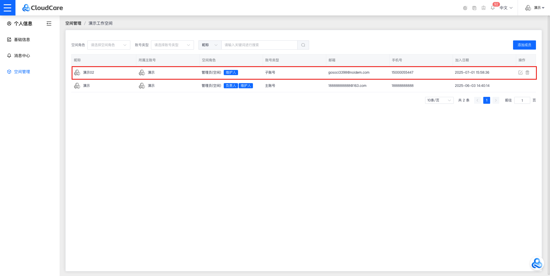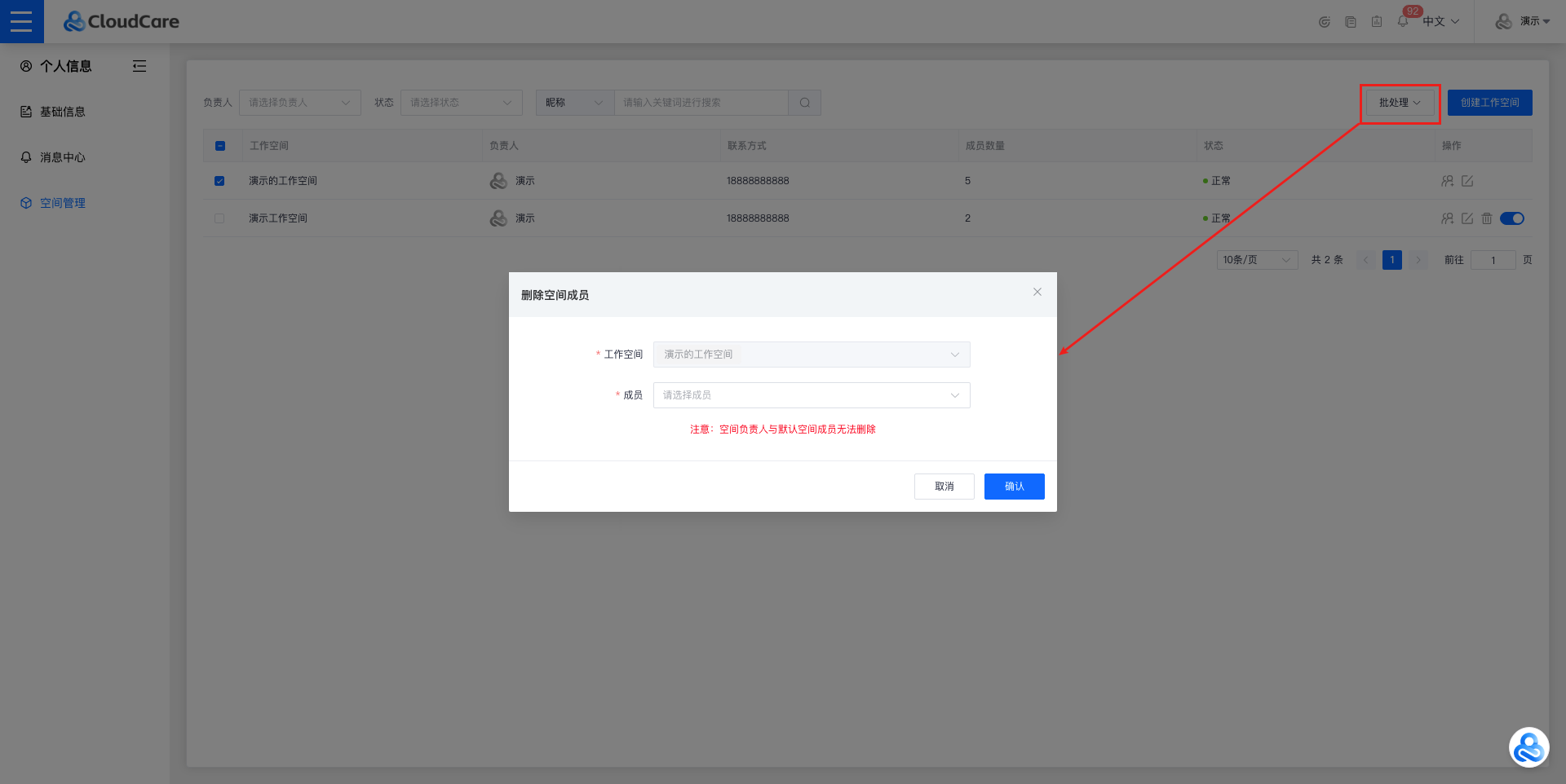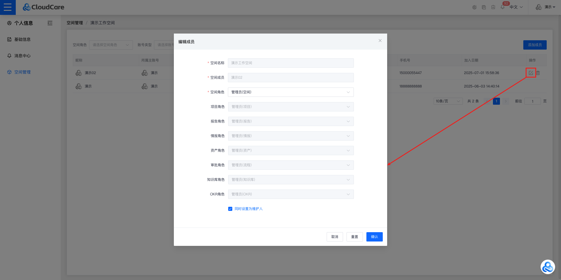 点击右上角“账号信息”,找到“[空间管理](https://enterprise.cloudcare.cn/user/space "空间管理")” 或 点击左上角 “功能菜单”,找到 “个人信息”-“[空间管理](https://enterprise.cloudcare.cn/user/space "空间管理")” ,点击进入 “[空间管理](https://enterprise.cloudcare.cn/user/space "空间管理")” 功能页面。  # 空间列表 > 用于管理以及展示内外部工作空间信息。  ## 创建 点击右上角 “创建工作空间”,并在 “创建工作空间” 弹窗中填写以下字段信息: - 空间名称(支持至多20位字符) - 负责人(可选主账号名下的内外部主/子账号,负责人将被默认添加为该空间管理员) 点击 “确认” 后,即可完成工作空间创建 > 注意:如[外部主账号B]以空间管理员的身份邀请[外部主账号C]加入[主账号A]拥有的工作空间,则需要[主账号A]先邀请[外部主账号C]加入其系统账号中,否则将无法加入该工作空间。  ## 编辑 点击空间操作栏“编辑”按钮,可修改如下字段内容 > 更改负责人后,新的负责人将会被授予空间管理员权限  ## 禁用/启用 点击空间操作栏“禁用”按钮,并进行二次确认,即可禁用指定的工作空间。 > 禁用后,空间数据将会保留,但无法进入该工作空间。  点击空间操作栏“启用”按钮,并进行二次确认,即可启用指定的工作空间。 > 启用后,可进入该工作空间维护空间数据。  ## 解散 点击空间操作栏“解散”按钮,并进行二次确认,即可解散指定的工作空间。 > 解散后,空间数据将不再保留,请谨慎操作。  # 空间成员 点击空间操作栏“成员管理”按钮,即可进入该空间成员列表进行管理。  ## 添加(包含模块权限) > 添加空间成员需至少具备空间管理权限 点击空间成员列表右上角的 “添加成员” 按钮,并在 “添加成员” 弹窗中填写以下字段信息: - 空间成员(选择主账号下成员) - 空间角色(管理员,读写,只读) > 可选角色受限于系统角色,详见“[角色权限](https://mrdoc.cloudcare.cn/doc/368/#h1-u89D2u8272u6743u9650 "角色权限")” - 模块角色(可选角色受限于空间角色,详见“[角色权限](https://mrdoc.cloudcare.cn/doc/368/#h1-u89D2u8272u6743u9650 "角色权限")”) - 项目角色(管理员,读写,只读) - 报告角色(管理员,读写,只读) - 情报角色(管理员,读写,只读) - 资产角色(管理员,读写,只读) - 审批角色(管理员,读写,只读) - 知识库角色(管理员,读写,只读) - OKR角色(管理员,读写,只读) - 同时设置为维护人(只有空间管理的人才可以被设置为“维护人”) 点击 “确认” 后,即可完成空间成员添加  ## 编辑 点击空间成员操作栏中的 “编辑” 按钮,即可编辑空间成员的以下字段信息: - 空间角色 - 模块角色 点击 “确认” 后可保存修改的信息。  ## 删除 点击空间成员操作栏中的 “删除” 按钮,并进行二次确认,即可删除指定的空间成员。 > 删除后,将保留该项目成员数据,但空间内容不再对其可见。  ## 空间成员批处理 > 除进入空间成员管理进行添加成员外,系统管理员还可通过在空间管理页面的右上角点击“批处理”-“批量添加/删除空间成员”的方式,来将多个指定系统成员在多个不同的工作空间中进行添加/删除。   # 管理模式 > 账号登录后,可通过左上角的空间下拉列表切换其需要管理或查看的工作空间数据,该列表正序排列且支持检索。 - 指定工作空间:当选择某个指定工作空间时,页面将仅获取该空间的权限及其数据。常规CURD类操作,将基于登陆用户在该空间模块的权限进行校验。 - 全部(管理):当登录用户具备至少一个可管理的工作空间时,才可使用该列表选项。点击“全部(管理)”后,页面将获取登录用户具备管理权限的所有工作空间数据及其权限。常规CURD类操作,将基于登陆用户在各空间各模块的权限进行校验。